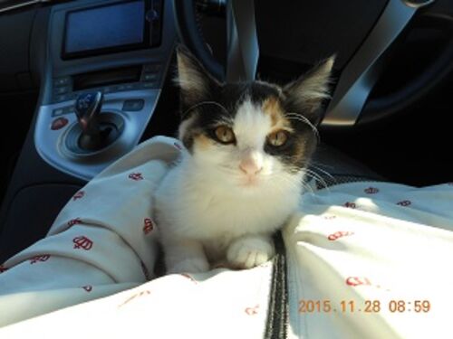 11月28日(土) はれ。 ミケル。 ウチに来てから、はや2週間。 本日は 健康診断&ワクチン接種に。 病院では おとなしかったデス。 はじめての病院、 ちょっと疲れたねー。 車が 怖いみたいで。 ずっと 私マリーの服の中で 顔をうずめてました。 体重も…