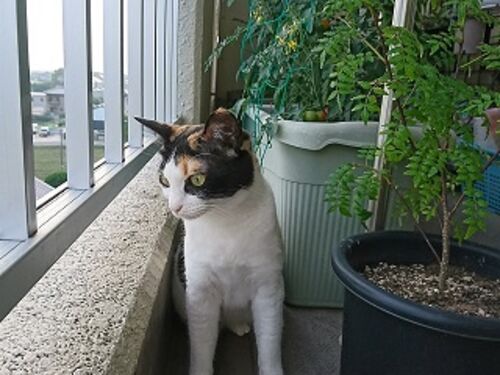 6月28日(水) はれ。 ベランダで 夕涼み。 まったりモードのミケちゃん。 コタちゃんは… 葉っぱが 気になって 仕方がないみたい。笑