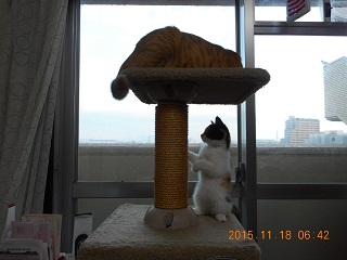 2015-11-18 気になるニャ。 ♪コタロー&ミケル 11月18日(水) ミケちゃん、 どうしても 気になる… コタちゃんのしっぽ。 ニャッ! もう1回… ニャッ! コタちゃんパンチ! 怒られた。笑